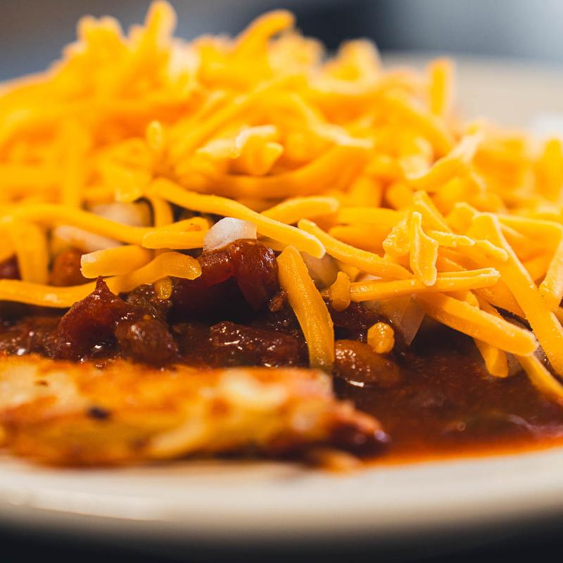 Hash browns topped with a hamburger patty and eggs. Covered in Dave's famous chili | + Half Slinger $12.50